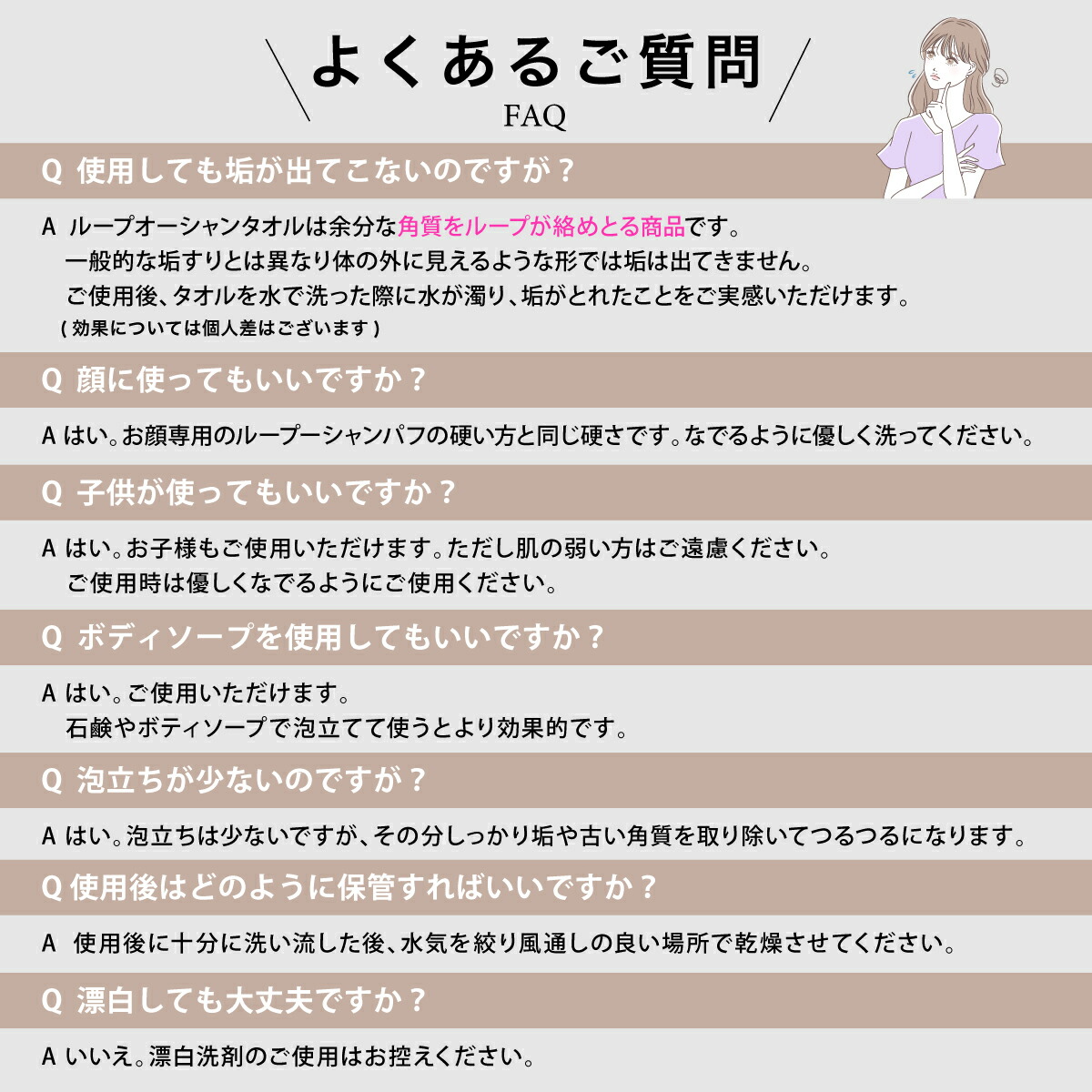 | ご注意 | ●用途以外には使用しないでください。 ●お肌の1か所を集中的に強くこすらないでください。お肌を傷める原因になります。 ●お肌に異常を感じた場合はご使用をおやめください。 ●漂白剤は使用しないでください。 |