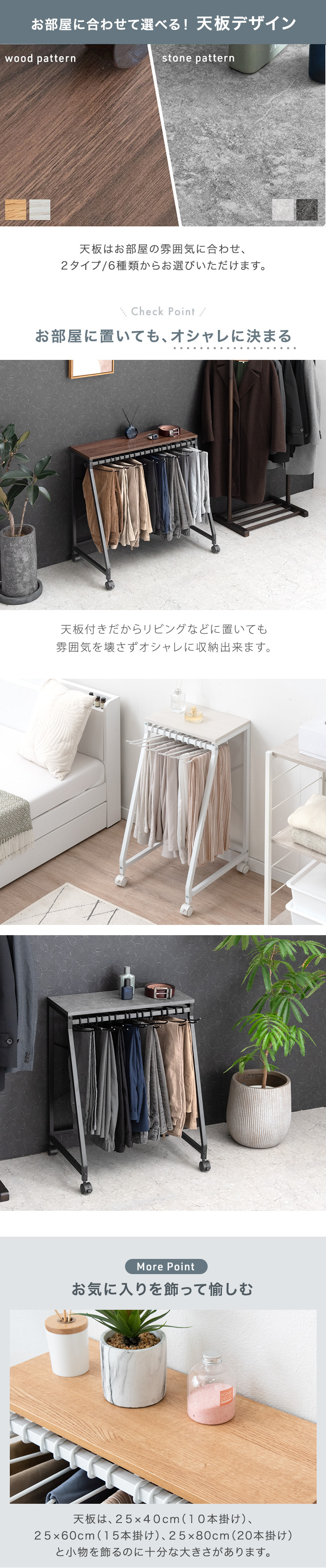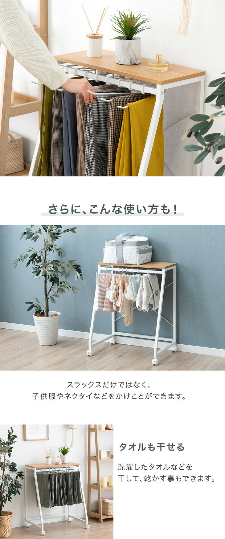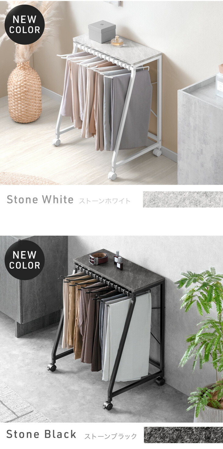 ・簡単に出し入れできる独自ハンガー設計 ・ハンガーの落下を防ぐストッパー ・衣類がおちにくい!滑り止め付 ・暮らしに合わせて選べる!3サイズ ・お部屋に馴染木目調&石目調天板 ・使いやすいコンパクト設計 ・頑丈なスチール製 ・キャスター付で移動やお掃除楽々! |