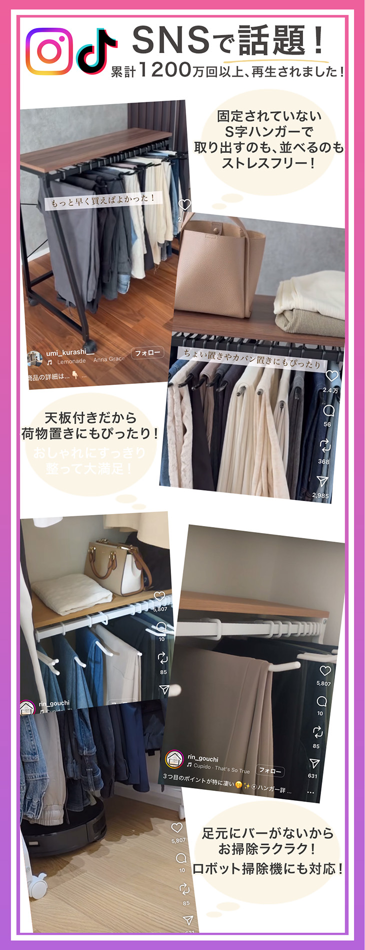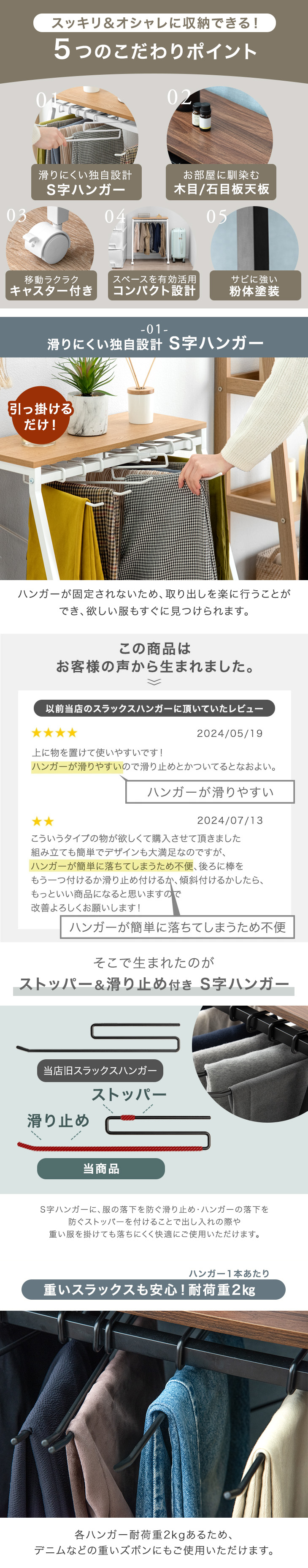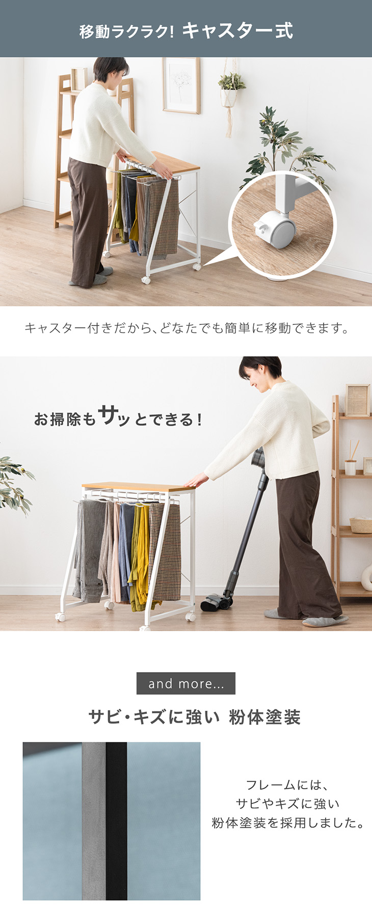 ・簡単に出し入れできる独自ハンガー設計 ・ハンガーの落下を防ぐストッパー ・衣類がおちにくい!滑り止め付 ・暮らしに合わせて選べる!3サイズ ・お部屋に馴染木目調&石目調天板 ・使いやすいコンパクト設計 ・頑丈なスチール製 ・キャスター付で移動やお掃除楽々! |