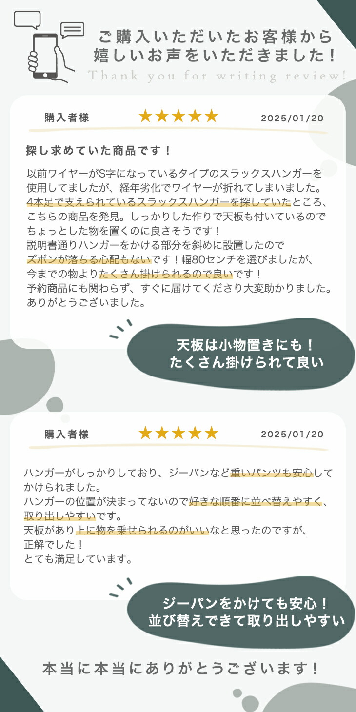 | 備考 | 【組立品(約1時間)】【意匠権登録済み】 ※組み立ては必ず2人以上で行って下さい。 ※配送は全て宅配便(1人)での玄関渡しとなります。大型商品や重量商品、エレベーターの無い2階以上にお住まいのお客様は、玄関口までの搬入をお手伝いをお願いしております事をご了承ください。 ※ ストッパー部分は、スラックスバーに干渉することでハンガーが簡単に落下することを防止します。緩い、もしくはきつい場合は手で調節をお願いします。 |