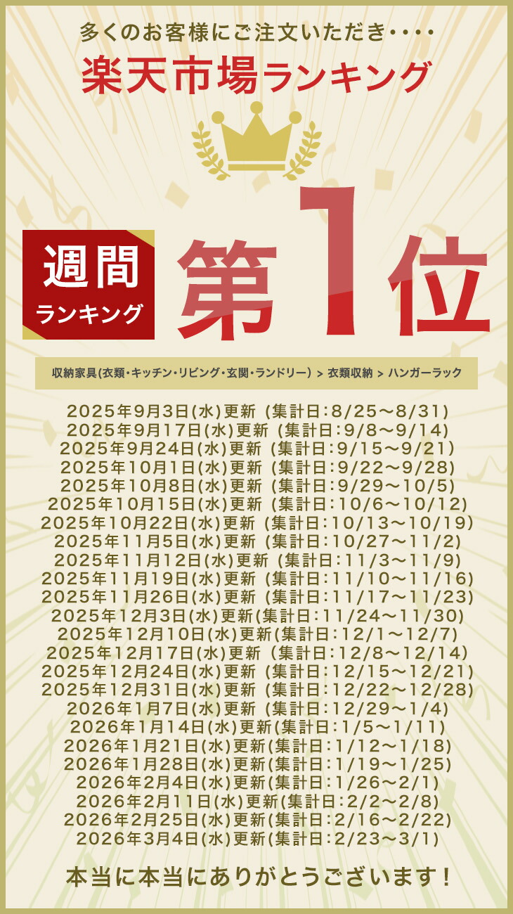 | 梱包サイズ | 【1個】 10本掛け:約79×31×7cm(約5.9kg) 15本掛け:約79×31×7cm(約7.3kg) 20本掛け:約90×31×9cm(約9.2kg) 【2個セット】 10本掛け:約79×31×13cm(約11.5kg) 15本掛け:約79×31×13cm(約14.3kg) 20本掛け:約90×31×15cm(約17.7kg) |