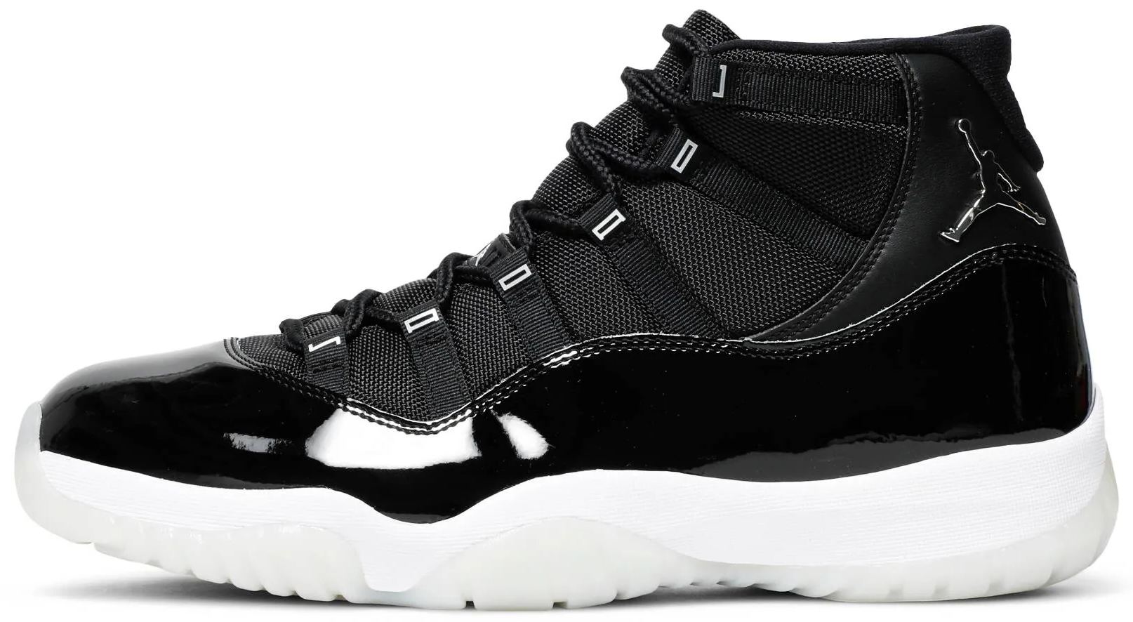 The Air 11 Retro 閳?5th Anniversary閳?celebrates the classic silhouette閳ユ獨 quarter-century birthday with a monochrome black finish throughout the upper . constructed from a traditional blend of ballistic mesh and patent leather. In keeping with the shoe閳ユ獨 silver anniversary . a 3D metallic Jumpman and matching 閳?3閳?branding decorate the heel . while 閳ユǚ鈧?is spelled out in stylized silver lettering on each of the sneaker閳ユ獨 eyelets. The mid-top rides on a classic white foam midsole . supported by a translucent rubber outsole.