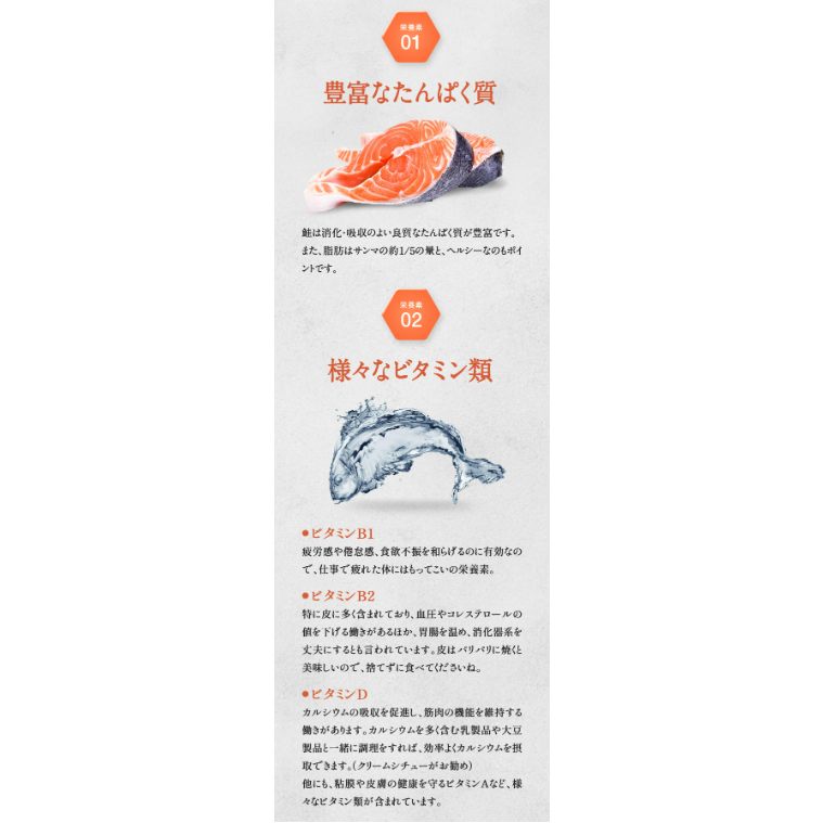 解凍後、まずはグリルやオーブンで焼いて、そのままお召し上がり下さい。引き締まった身と上質な脂のり、ふっくらホクホク感を存分に味わえます。パリパリに焼いた皮も絶品なので、捨てずにお召し上がり下さい。焼いてそのまま食べる他にも、フレークにしておにぎりやお茶漬け、パスタ、チャーハンにトッピングするのもお薦めです。また、甘塩なのでムニエルや味噌漬け、石狩鍋などいろんな料理にも使えます。是非お試し下さいませ~ |
