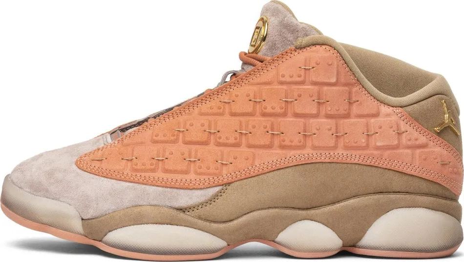 The CLOT x Air 13 Low 'Terracotta' takes inspiration from the famed Terracotta Warrior statues of the Shaanxi Province of China. The low-top閳ユ獨 suede upper has faux padded construction that mimics the warriors閳?armor . while the subtle colorway mirrors the oxidized terracotta material of the sculptures. Gold foil CLOT and Jumpman badges adorn the shoe閳ユ獨 tongue and lateral heel.