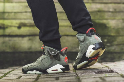 The Travis Scott x Air 6 Retro 'Olive' represents a collaboration between the Houston based rapper and Brand. This take on the AJ 6 . which Scott debuted while performing during halftime of Super Bowl 53 . released in October 2019. It features a Medium Olive . black . Sail and University Red colorway along with several unique elements: a small pocket with a snap on the collar . a nubuck and suede upper . Scott's 'Cactus Jack' logo on the heel and a glow-in-the-dark translucent outsole.