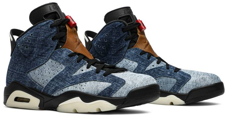 Famously inspired by Michael 's German sports car . the Air 6 Retro conveys speed and class. This version閳ユ敆nveiled in December 2019閳ユ敄ransforms the icon from court performer to street ready through a 'Washed Denim' upper with the signature synthetic tongue. Touches of Varsity Red are placed on the rear spoiler and Jumpman branding on the neoprene sleeve. Its Air-Sole is set atop a translucent rubber tread pattern.