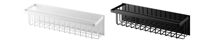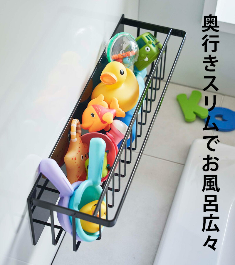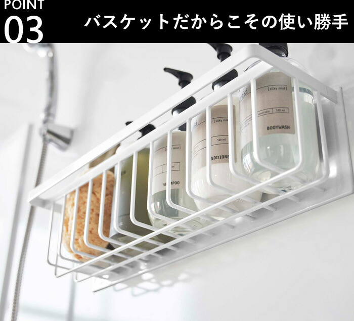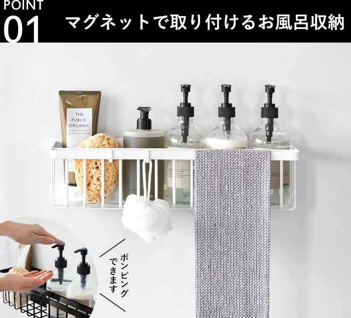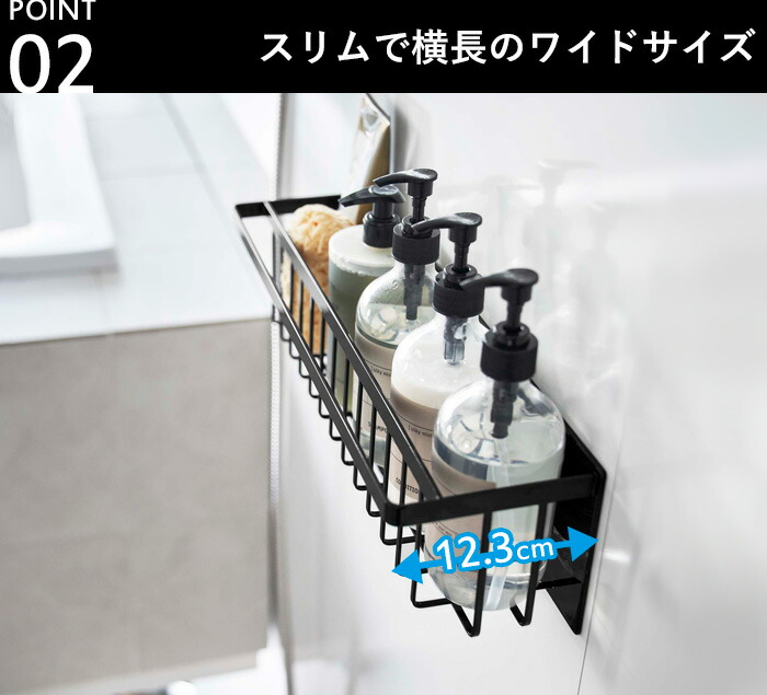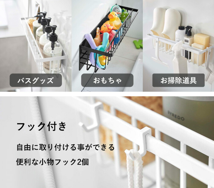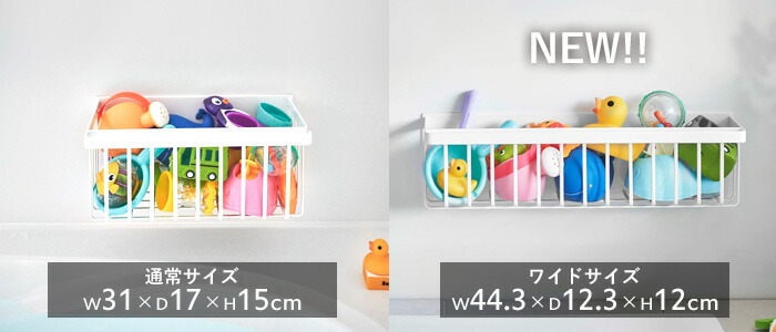| 浴室壁面に強力マグネットで取り付けられる奥行スリムなワイドバスケット。 ディスペンサーボトル・チューブを並べて収納。手前のバーにはタオルなどを掛けられます。 バスケットタイプで水切れがいいので乾きやすく、小さなおもちゃの収納にも便利。 小物を掛けられる便利なフック付き。 |