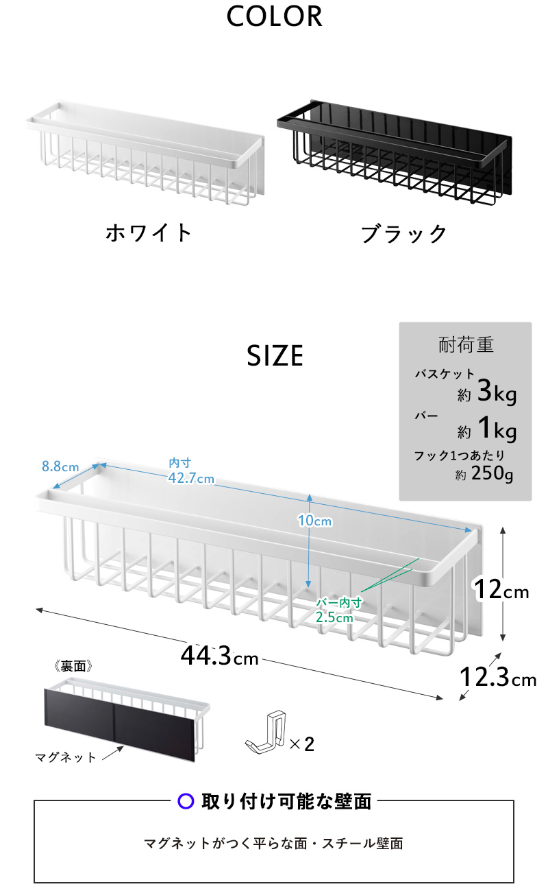 | 耐荷重 | バスケット:約 3kg、バー:約 1kg、フック1つあたり:約 250g |